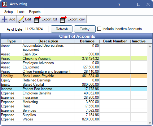 The Chart of Accounts is a list of the accounts used to organize finances and divide expenses, revenue, assets, liabilities, and equity. When set up correctly, certain transactions in Open Dental automatically create accounting transactions in the Chart of Accounts.