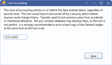 Enter the lock date, then click Save. All entries made before the entered date are locked. To edit locked entries, the date must be temporarily removed by a user with the "Security Admin" Permission.