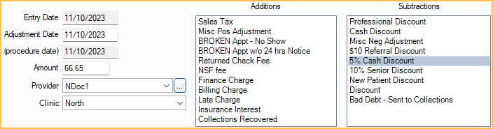 The clinic and provider of the adjustment must match the attached procedure. If the provider and clinic do not match, the procedure value is not updated and the adjustment is considered a separate charge when a payment is applied.