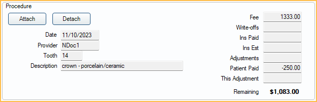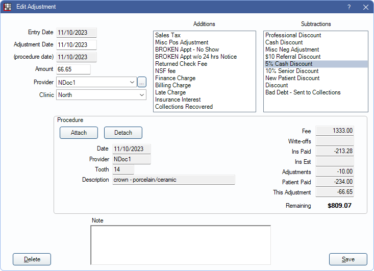 Attach: Select a completed procedure from the Select Procedure window. Subtraction adjustments reduce the procedure fee and Addition adjustments increase the fee.