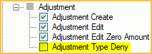 Users in the selected user group do not have access to the selected Adjustment Types. When creating a new adjustment (or editing an existing adjustment), denied Adjustment Types are hidden in the Adjustment Type lists.