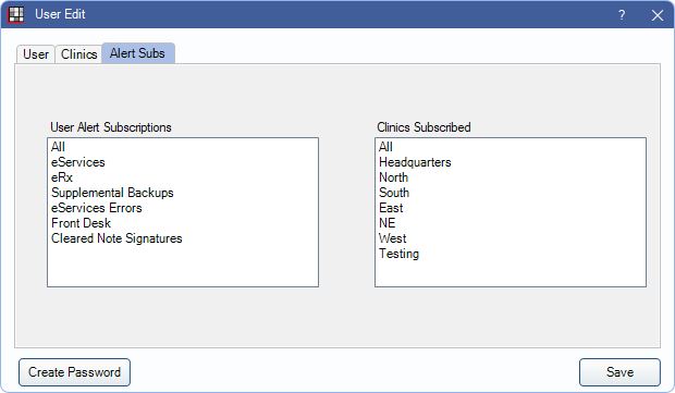 Clinics Subscribed: If using Clinics, select the clinics a user is to receive alerts for. All Clinics are listed, regardless of Clinic restrictions set in the Clinics tab.