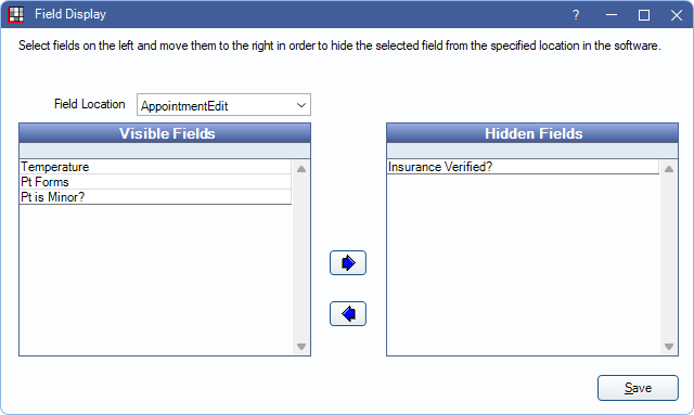 From Field Display, choose which Appointment Field Defs are visible or hidden in the Edit Appointment window.