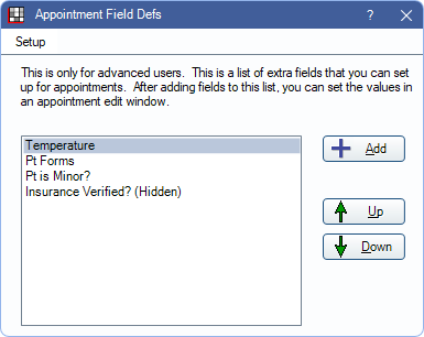 In the Main Menu, click Setup, Appointments, Appointment Field Defs.