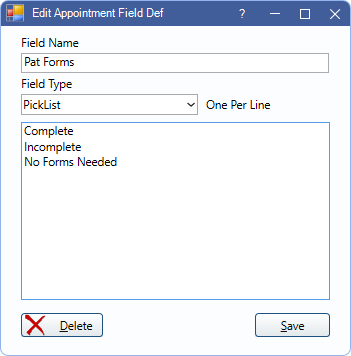Delete: If no data has been entered in a custom appointment field for a patient, it can be deleted.
