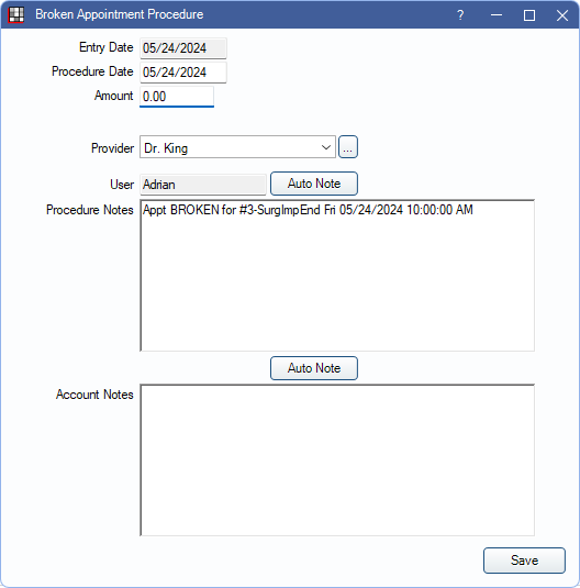 - Procedure Notes: Displays as a Note in the Procedure Info window. Automatically includes text of Appt BROKEN for, procedure abbreviations, and date/time of appointment. Edit as needed. Click Auto Note to insert Auto Note template.