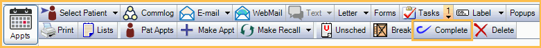 In the Appointments Module, select the appointment. In the toolbar, click Complete