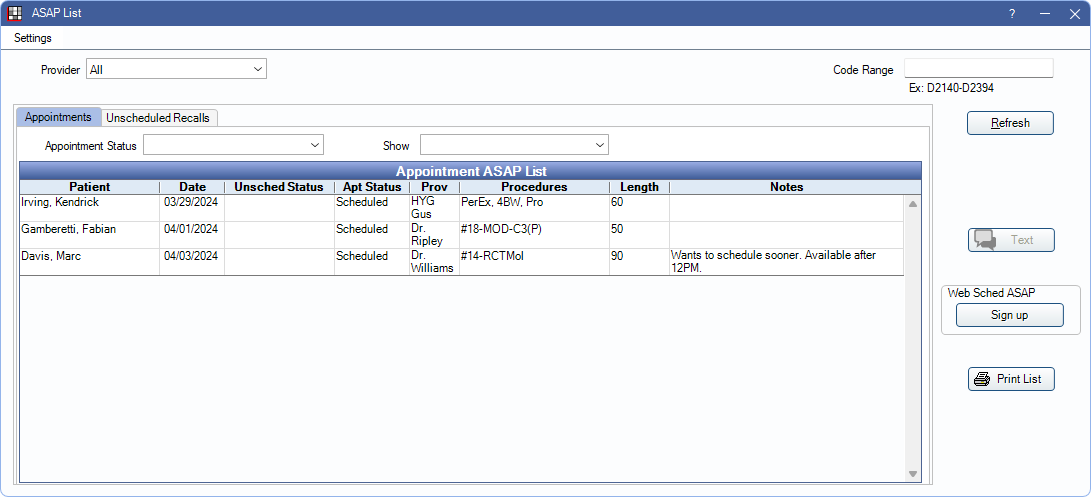 The ASAP List can remain open while other areas of Open Dental are open. Use the list to identify patients and quickly notify them about available openings. Appointments can also be scheduled from here.