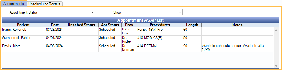 By default, the Appointments tab opens. This lists scheduled, unscheduled, planned, and broken appointments that have been marked ASAP.