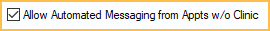 Allow Automated Messaging from Appts w/o Clinic: This option applies to eReminders, eConfirmations, Automated Thank-You messages, and General Messages when the clinic on an appointment is set to none.
