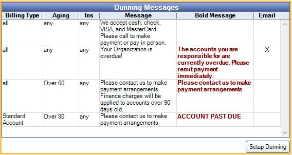 Dunning Messages include notes for patients whose statements meet specific criteria.
