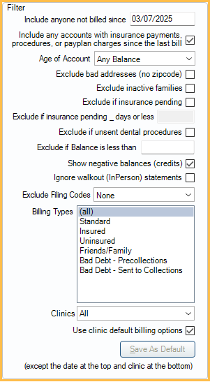 - Use clinic default billing options: Only shows when All is the selected clinic. Useful when each clinic has different filter defaults, yet the Billing List should be run for all clinics at once. Checking this option generates each clinic's statements using its filter defaults.