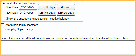 - General Message: Shows at the bottom of the statement in addition to dunning messages and appointment information. This text box supports Right-Click Options.