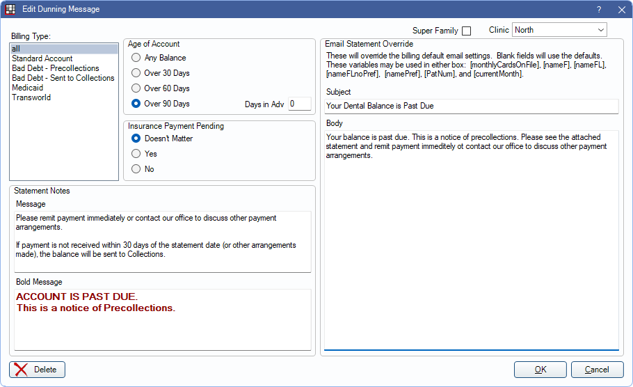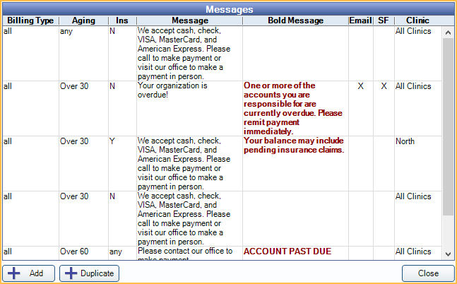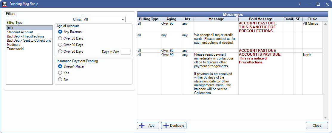 Dunning Messages are notes and email messages that show on Billing statements generated via the Billing List. The messages are generated based on account aging, insurance pending, Billing Type, or a combination of these criteria.