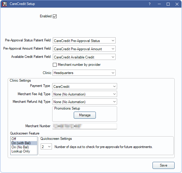 - Merchant number by provider: Only displays when clinics is enabled. Determines how the Merchant Number (provided by CareCredit) is entered.