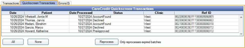 Click Reprocess to process the Quickscreen transaction for selected patients with a status of ExpiredBatch. The status is set to Pending and the transaction is reprocessed during the next Batch Quickscreen