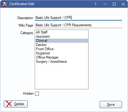 - Delete: Delete the selected certification. Certifications cannot be deleted if they are in use by an employee.