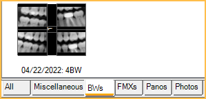 The tabs below Patient Info reflect Image categories that have been marked as Show in Chart module in Definitions: Image Categories. This is useful to view items like radiographs and photos directly in the Chart Module.