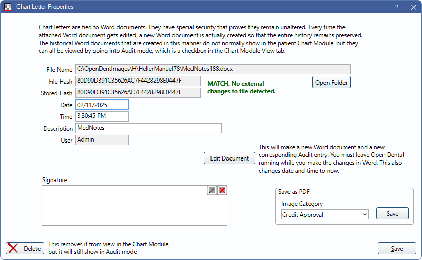 File Hash / Stored Hash: A unique identifier to determine if the document has been edited outside of Open Dental. Displays Match if the document has only been edited by clicking Edit Document from Open Dental or No Match if the document was edited by accessing the document outside Open Dental.