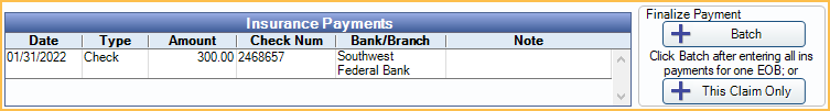 Batch: Click to finalize a bulk insurance payment attached to multiple claims. See Finalizing a Bulk Insurance Payment below for detailed steps.