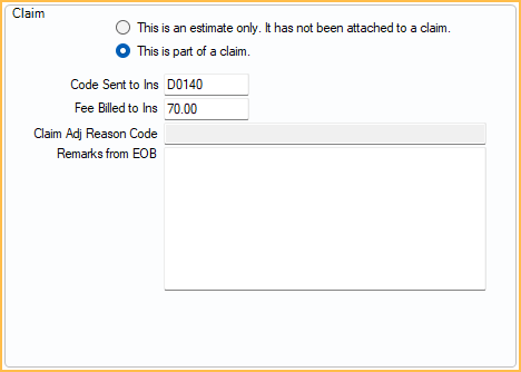 To make changes to fields in this area, except Remarks from EOB, the claimproc must be opened by double-clicking the procedure from the Claim window.
