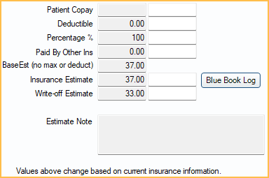 Estimate Note: Contains automatically generated notes about maximums, limitations, exclusions, etc. that may affect the insurance calculations and also display in the Treatment Plan.