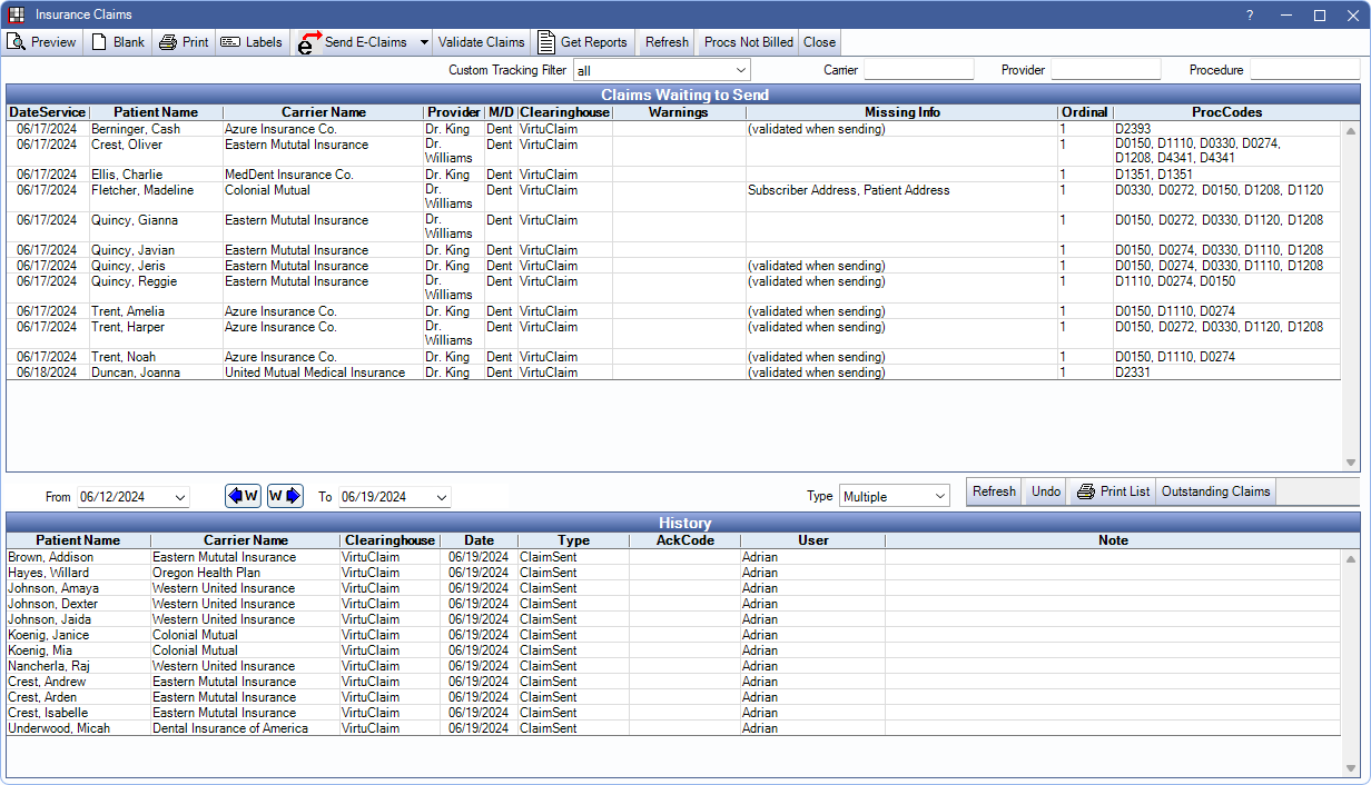 - Validate Claims: Validate selected e-claims for missing information before sending. If no claims are selected, all claims in the list are validated.