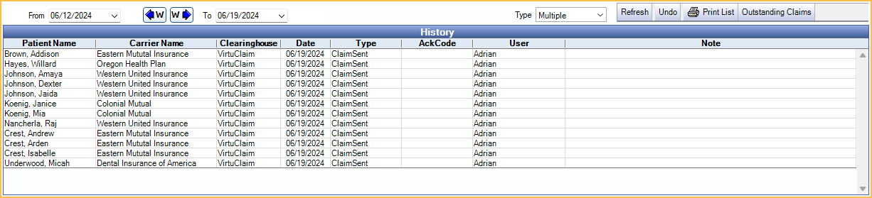 - Undo: If there was a problem with sending, highlight claims and click Undo. The claims are moved back to the Claims Waiting to Send grid and changed back to Waiting the Send status. Claims are still listed in the Claim History grid for historical record.