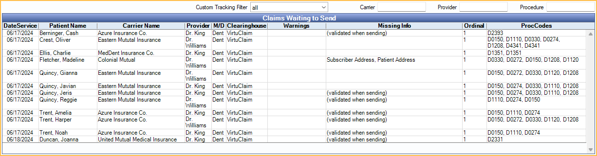 - Open Dental always validates e-claims when sending. If a claim has missing information, no claims in the batch are sent and the Missing Info column is populated. If a claim has already been sent, a warning is displayed and the claim is not resent.