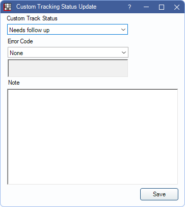 Custom Track Status: Select the status. Customize status options in Definitions: Claim Custom Tracking.