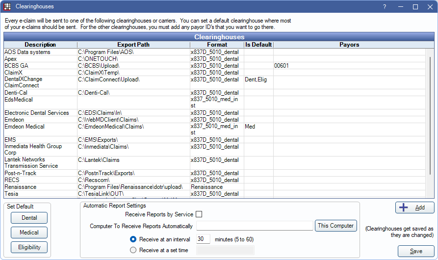 Clearinghouses are listed alphabetically. Click Add to create a clearinghouse that isn't listed. Double-click an existing clearinghouse to enter settings.