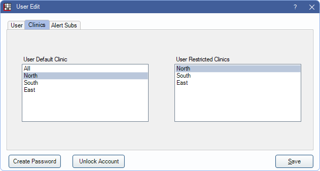 In the User Edit window, you can set the default clinic for a user and restrict the user to specific clinics.