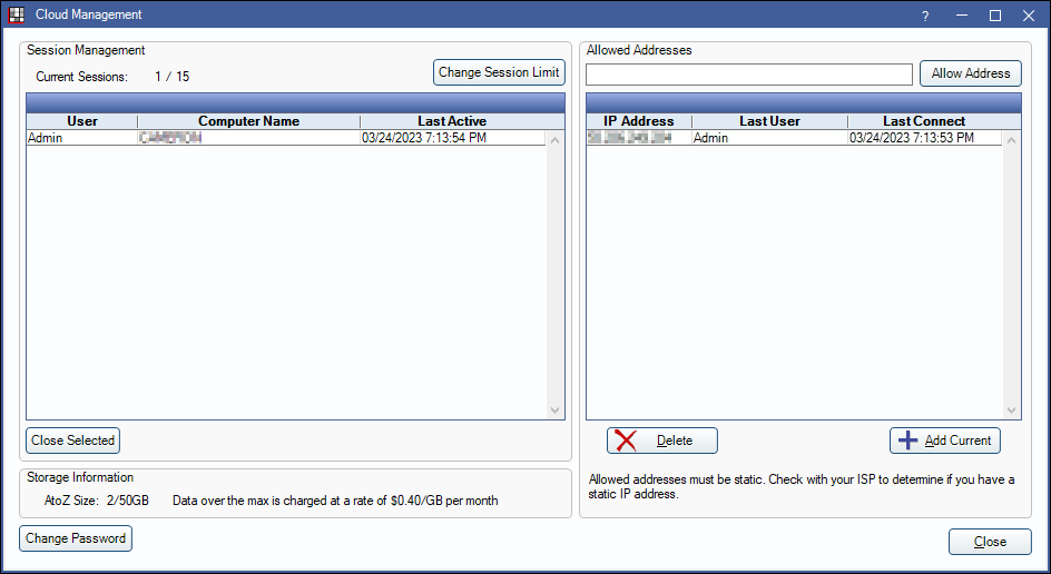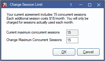 Change Session Limit: Click to add additional Cloud Sessions. The top of the window displays the current numbers of sessions included in your agreement. Additional sessions incur an additional fee. The following window opens.