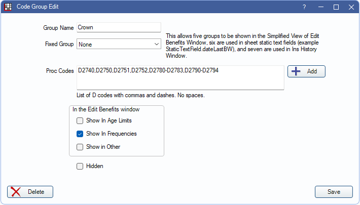 - Hidden: Check to hide this Code Group from the Age Limits grid, Frequency Limitation Benefits grid, and the Code Group dropdown in the Edit Benefit window. Automatically unchecks Show In Age Limits and Show in Frequencies when selected.