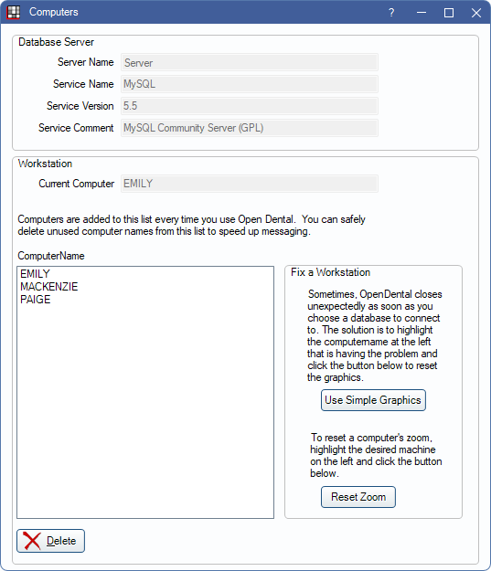 Computer Name: Any computer that has used Open Dental. Unused computers can be deleted to speed up messaging. Double-click a computer name to edit the graphics preferences for that computer. This is not recommended.