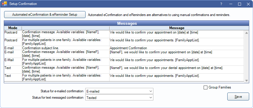 Use Confirmation Setup to define the default messages (text messages, emails, and postcards) for confirmations sent from the Confirmation List and set the default appointment confirmation status to apply when a confirmation is emailed or texted.