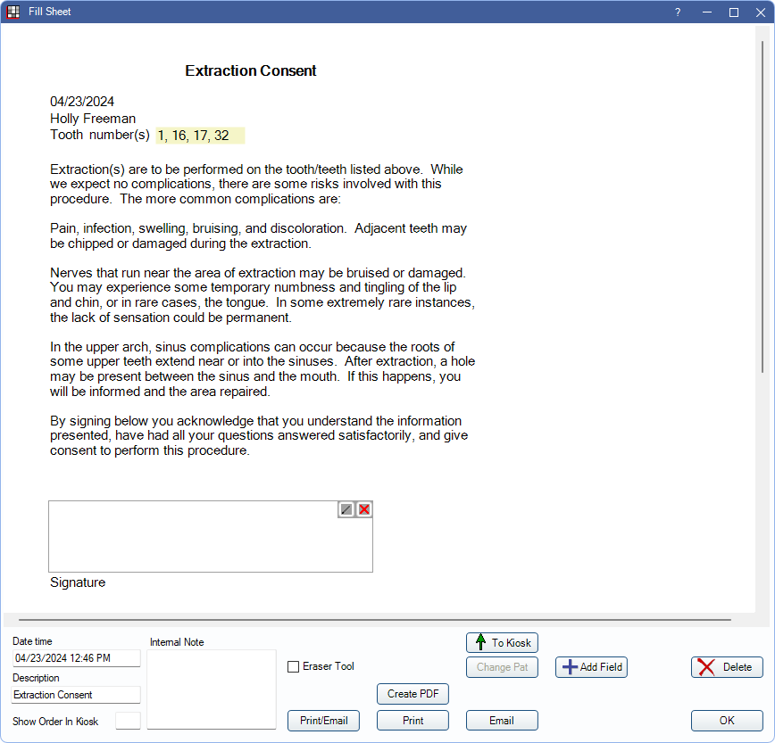The form is opened in the Fill Sheet window. Enter information as necessary. Pale yellow areas (e.g., Tooth numbers) indicate input areas.