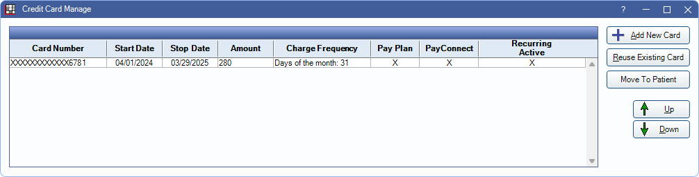 Move To Patient: Move a card or bank account to a different patient. Clear any recurring charges from the card first. Highlight the card or account, then click to select a new patient.