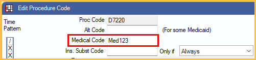 When a Medical Code is cross coded to the dental procedure code, only the dental procedure code needs to be charted. If a Medical Claim is created for the dental procedure, the Medical Code code is used on the claim instead of the dental Proc Code.