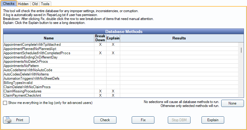 Database maintenance methods that are no longer needed or outdated are moved to the Old tab. Methods can still be run from this window, but only do so if instructed by Open Dental Support as they can be unnecessary and time consuming.
