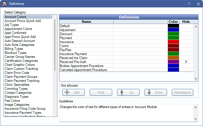 The Account Colors definition determines the text color of line items in the Account Module, Patient Account grid.