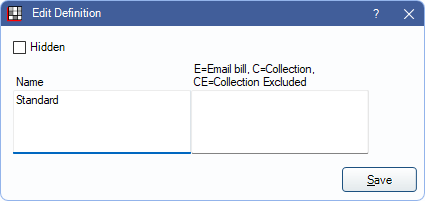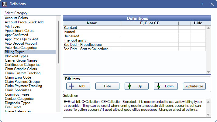 Create Billing Types to indicate how a patient is to be billed (e.g., email statements, send to collections, etc.).