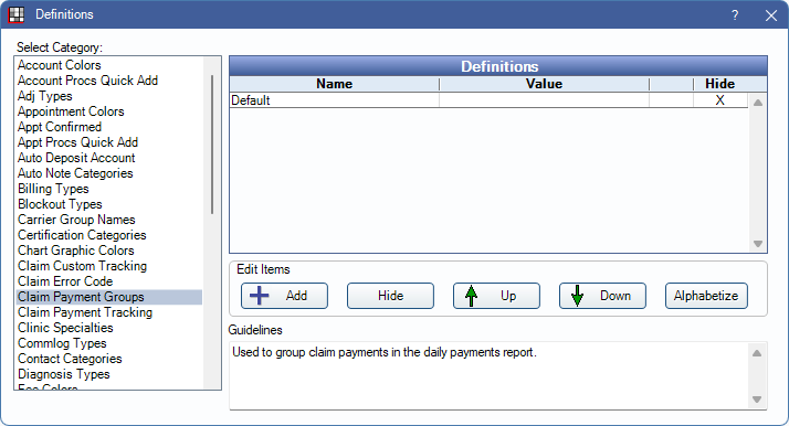 The Claim Payment Group definition determines the list of payment group options available when Finalizing Insurance Payments or entering Batch Insurance Payments. The Default item is added and hidden by default. Add Claim Payment Groups as needed.