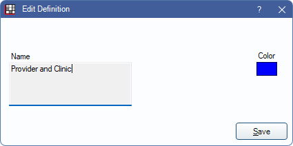 The Fee Color definition determines the text color of global fees, provider-specific fees, clinic-specific fees, and provider/clinic-specific fees in the Procedure Codes window.