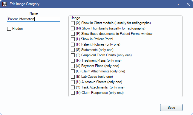 - Graphical Tooth Charts (only one): Check to store tooth charts saved from the Chart Module in this category.
