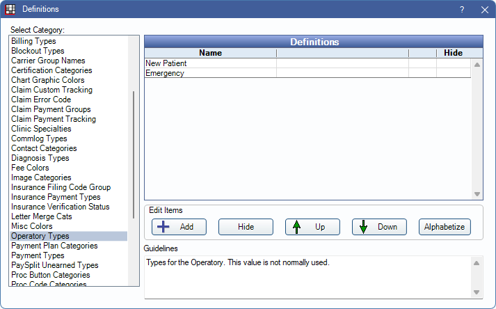 Operatory Types are informational only. This list is blank by default. Add new types as needed. Assign types to an operatory in Operatory Edit.