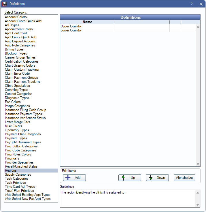 Region definitions determine the list of regions options available to assign to Clinics. This list is empty by default. Add new regions as needed.