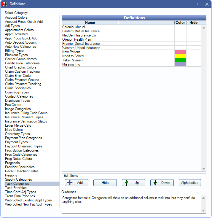 In the Main Menu, click Setup, Definitions, Task Categories.