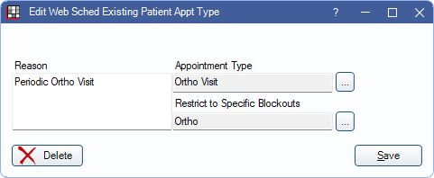 Create Appointment Types first to determine the length and procedures for certain types of appointments. Then assign the Appointment Type to the Web Sched Existing Appt Type. When a patient schedules an appointment online and selects one of these types from the list of appointment reasons, an appointment is created with the procedures and for the length designated in the associated Appointment Type.