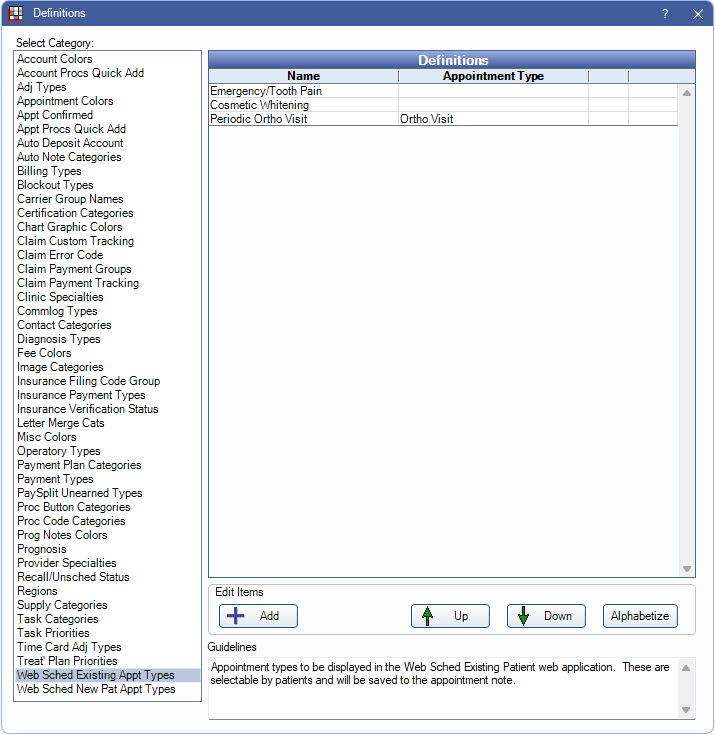 In the Main Menu, click Setup, Definitions, Web Sched Existing Appt Types.